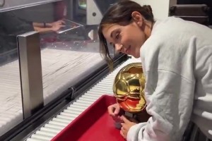 這傲嬌的小表情!邦馬蒂帶著金球獎杯過安檢