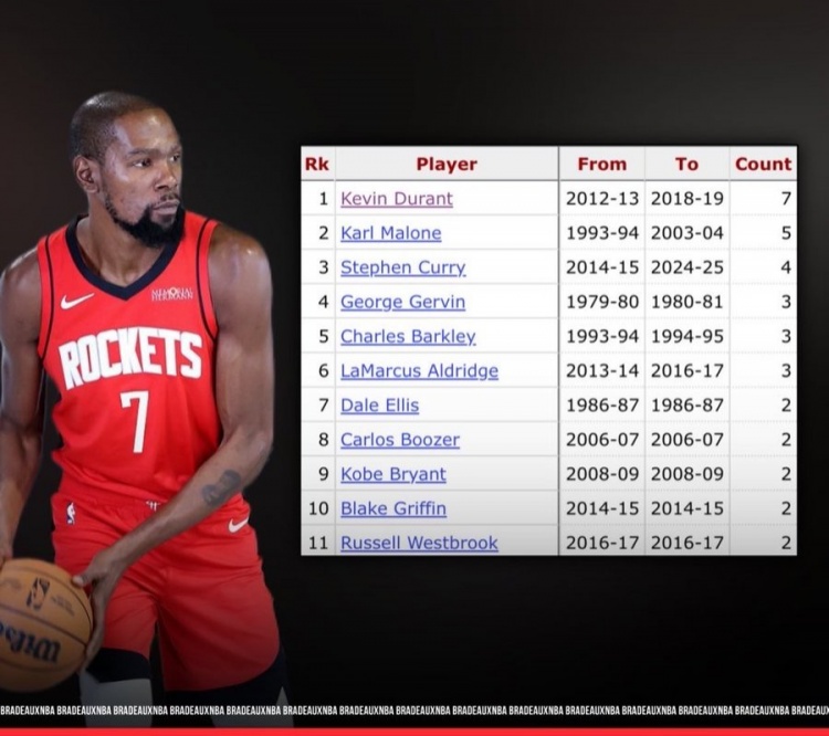杜蘭特在休斯敦對陣火箭季后賽?共砍下7次?30+,為歷史最多(共7場)。