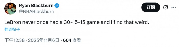 掘金記者Ryan Blackburn對此點(diǎn)評(píng)道:“詹姆斯從未有過30+15+15,這很奇怪?!?/p>