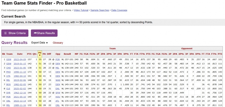NBA歷史首節(jié)50+的球隊(duì)如下: