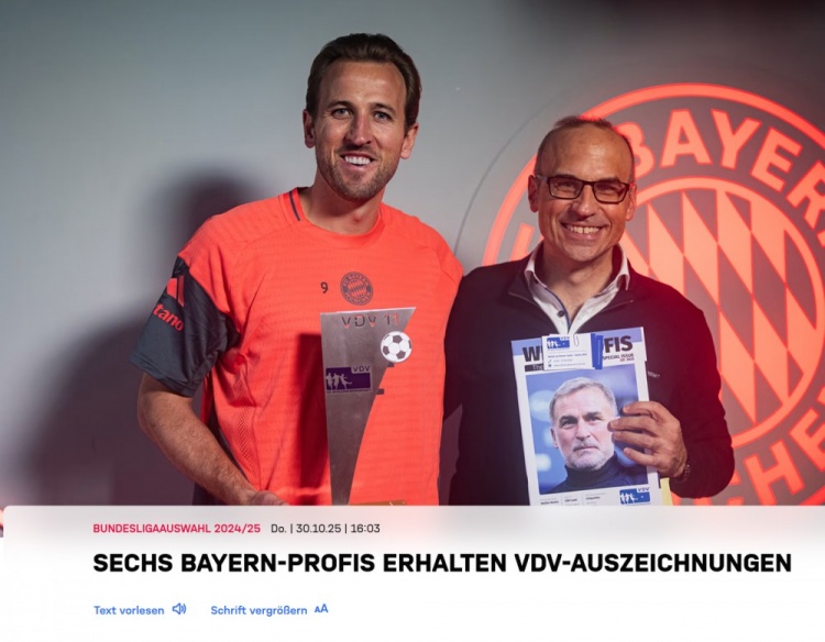 在VDV賽季最佳球員評(píng)選中,兩位拜仁球員躋身三甲。哈里-凱恩(20.0%)與邁克爾-奧利塞(17.0%)僅遜于衛(wèi)冕冠軍弗洛里安-維爾茨(29.1%)。