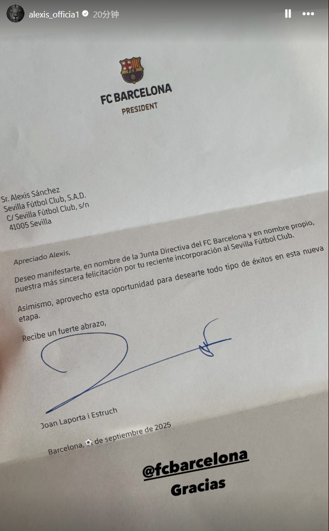 09月23日訊 36歲的智利前鋒、巴薩舊將桑切斯今夏回歸西甲加盟塞維利亞。今天他更新社媒,展示了一封老東家巴薩發(fā)來的賀信。信中大致寫道: