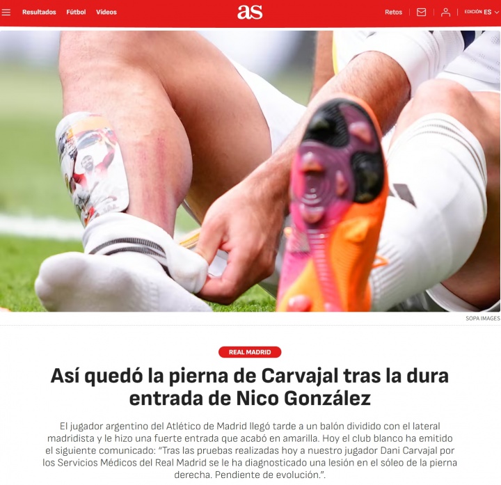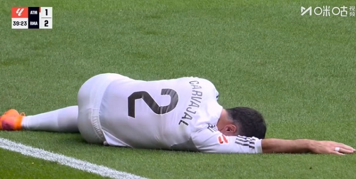 事件發(fā)生在馬競vs皇馬比賽的第40分鐘,馬競球員岡薩雷斯的鞋底蹬到了卡瓦哈爾的小腿,導致后者痛苦倒地,近距離圖像顯示,卡瓦哈爾的小腿當場顯現出了三道血痕。