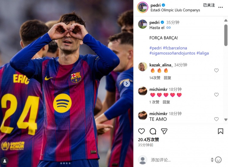 本場(chǎng)比賽佩德里打進(jìn)精彩進(jìn)球,賽后他也在社媒曬出慶祝進(jìn)球照片,配文寫道:“直到最后,加油巴薩!”