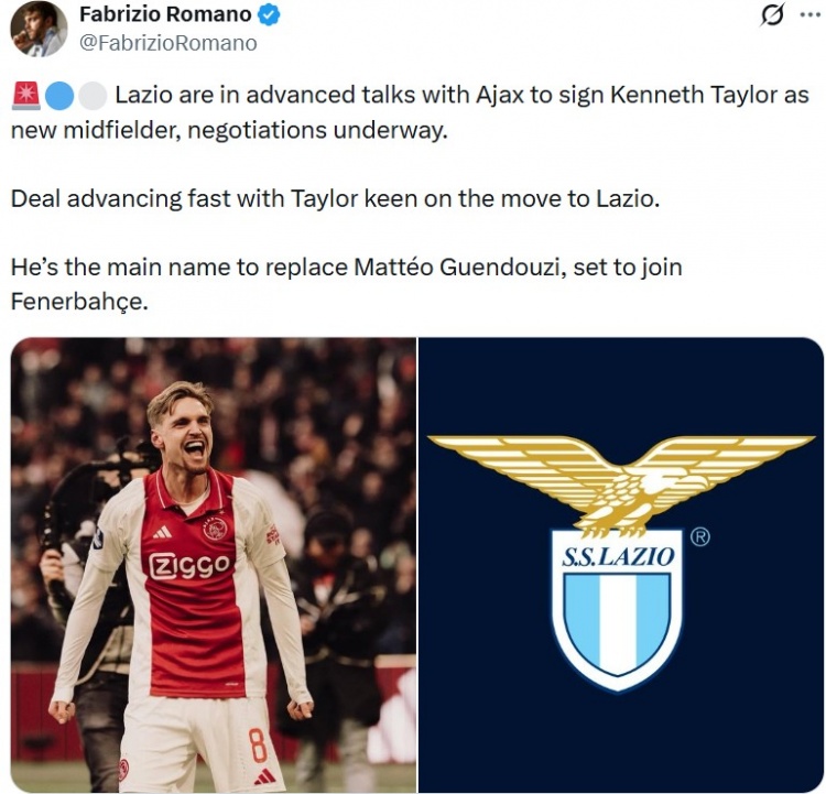 1月7日訊 據(jù)知名轉(zhuǎn)會記者羅馬諾報道,拉齊奧與阿賈克斯就中場肯尼思·泰勒交易進(jìn)行深入談判。
