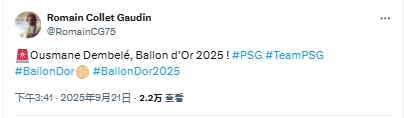 該記者表示:“奧斯曼-登貝萊,2025年金球獎得主!”這位記者供職于多家法國正規(guī)媒體,有比較高的可靠度。