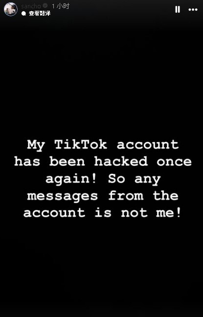 桑喬寫道:“我的TikTok賬號(hào)又一次被盜了!所以任何來(lái)自該賬號(hào)的消息都不是我本人發(fā)的!”
