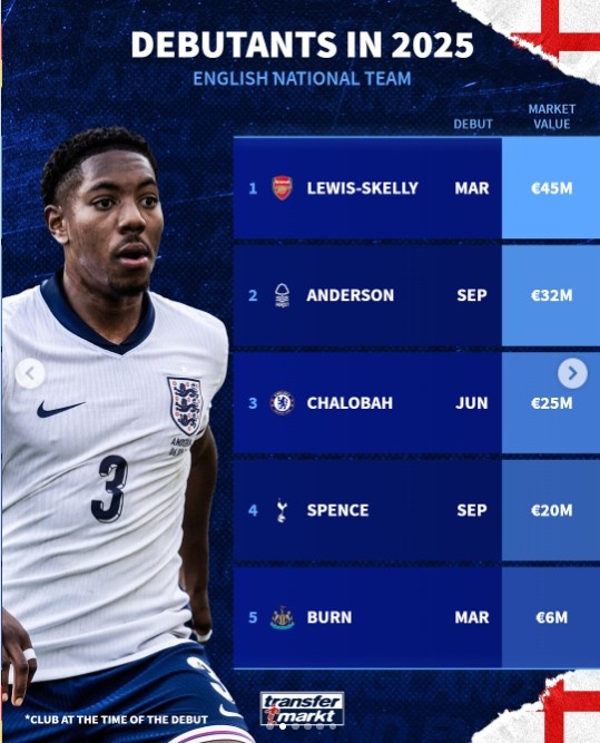 10月16日訊 德國轉會市場盤點了足球強國2025年上演首秀的球員,英格蘭共5名球員上演首秀,斯凱利、查洛巴、斯賓塞在列。