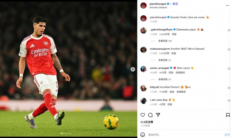 他也在賽后通過(guò)社媒曬出自己的比賽照并配文:“八強(qiáng)戰(zhàn),我們來(lái)了!”隊(duì)友加布里埃爾也現(xiàn)身評(píng)論區(qū)鼓勵(lì)道:“加油!”