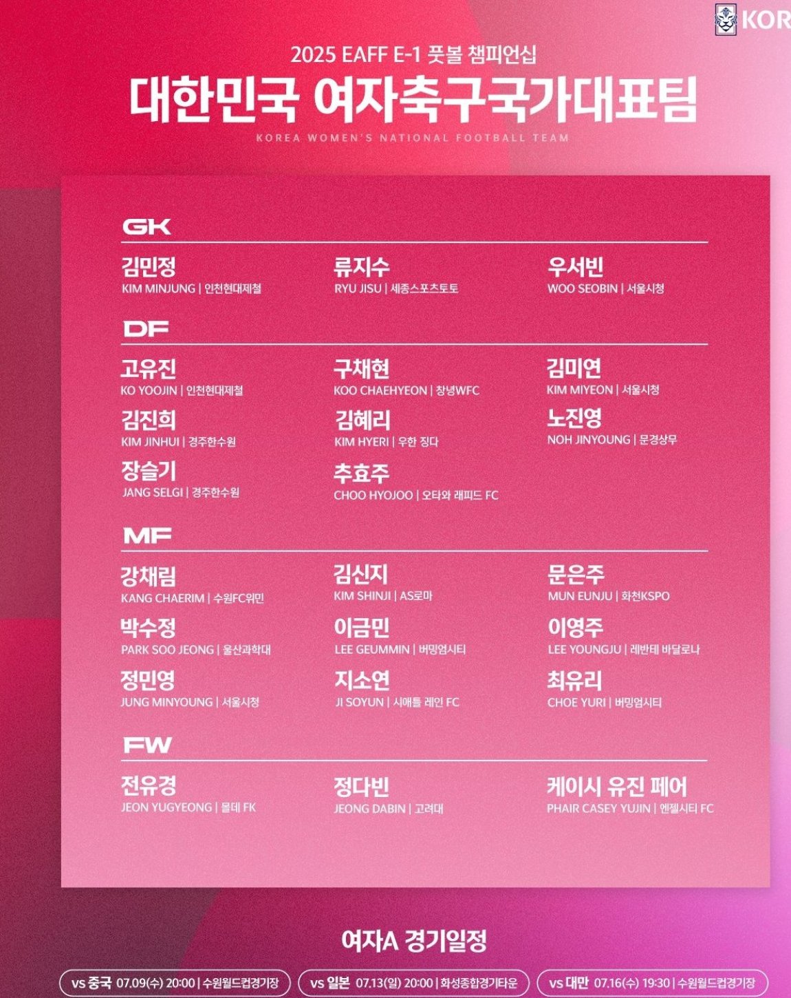 06月23日訊 韓國(guó)足協(xié)公布韓國(guó)女足東亞杯23人名單,這份名單由9名海外俱樂部球員、12名本土聯(lián)賽球員以及2名大學(xué)生球員組成。根據(jù)賽程,東道主韓國(guó)女足首戰(zhàn)7月9日19點(diǎn)對(duì)陣中國(guó)女足。
