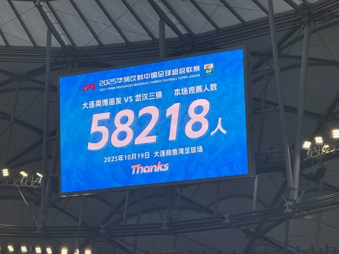 今天下午,大連英博在中超第27輪主場對陣武漢三鎮(zhèn),本場比賽到場觀眾人數(shù)為58218人。